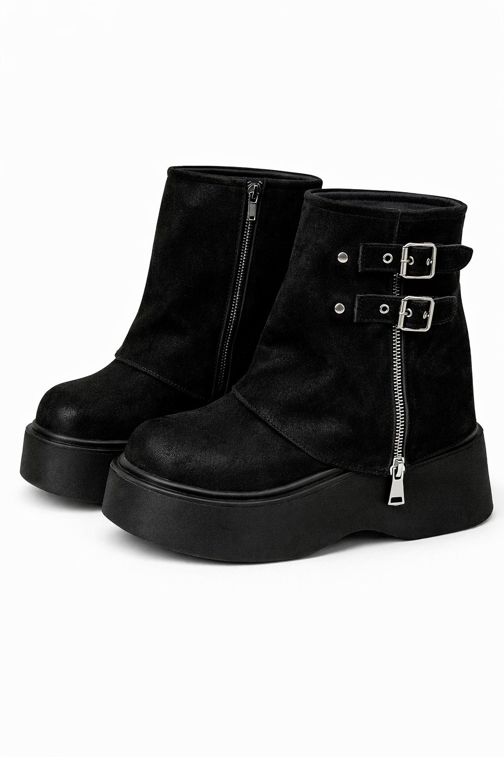 Elevate your style with the Buckle Zip Boot, a modern women’s ankle boot designed with premium suede, double metal buckles, and a smooth side zipper for easy wear. Built on a chunky platform sole for stability and comfort, this boot is perfect for everyday outfits, winter looks, and street-style fashion. Durable, stylish, and versatile — ideal for casual and urban wear.
