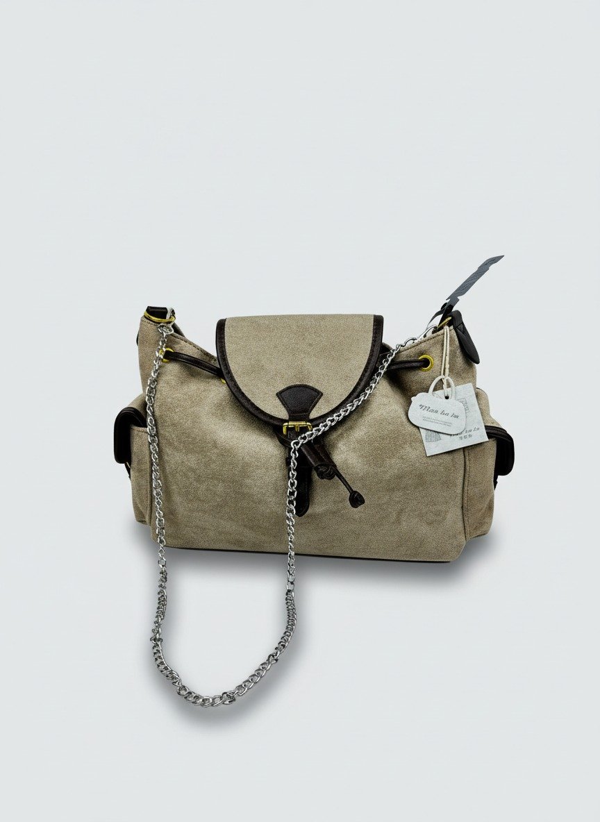 Stylish suede shoulder bag with black trim details. Features a secure flap closure, adjustable chain strap, and compact yet spacious interior. Perfect for daily wear or casual outings, combining modern elegance with practical design.