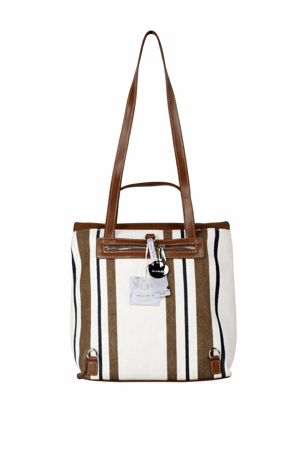 Elegant striped tote bag made with durable canvas and smooth faux leather details. Features comfortable shoulder straps, secure closure, and a spacious interior for daily essentials. Perfect for casual outings, work, and everyday use with a stylish modern look.